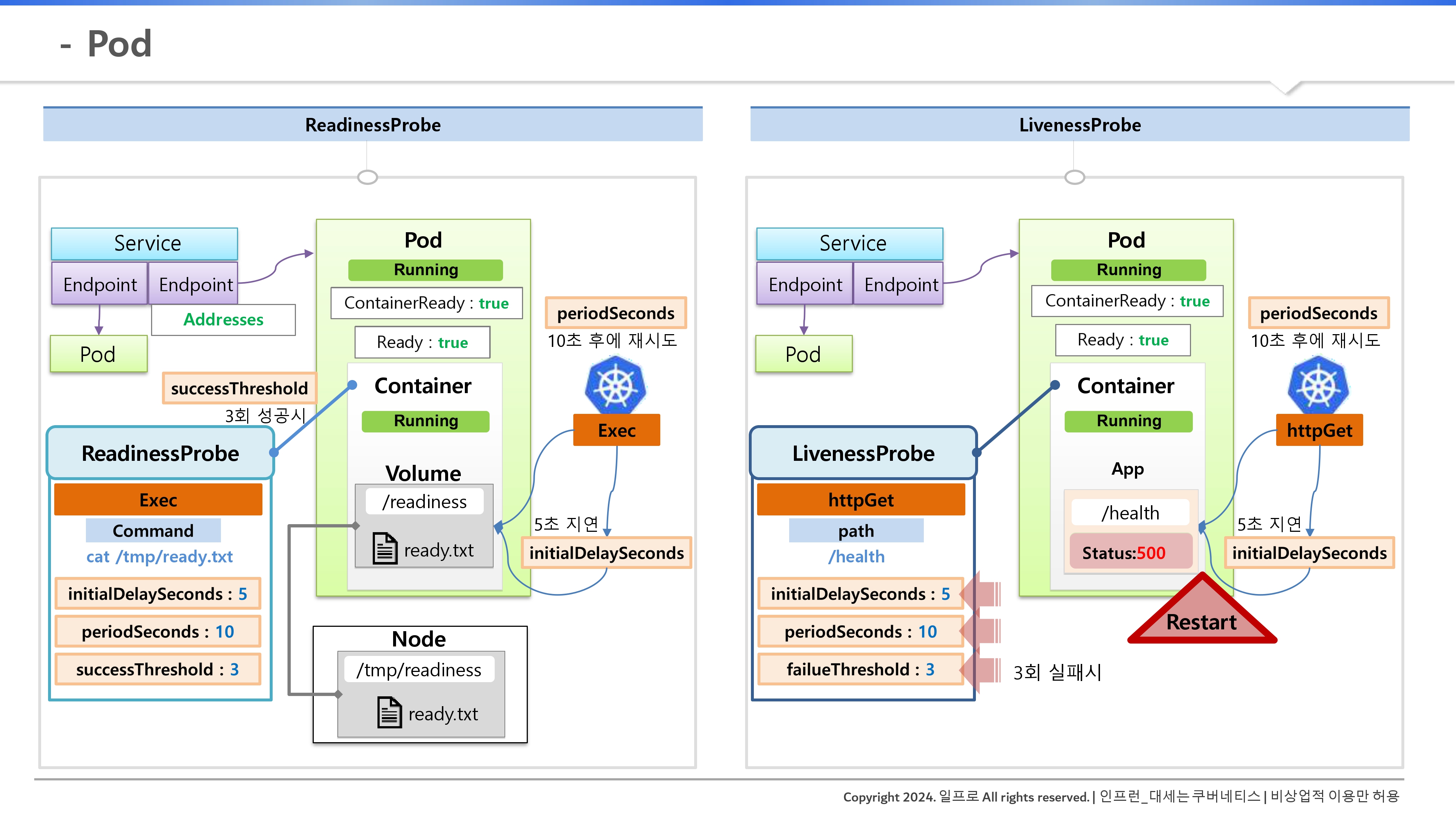 - 파드/컨테이너는 'Running'이지만 프로브가 성공 전까지 Conditions(ContainerReady, Ready)는 'False' 유지.
