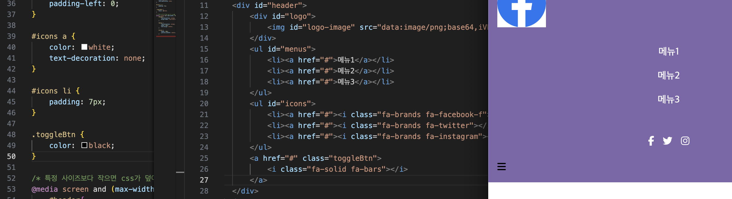 그럼 이제 사이즈가 작아질 때만 생기는 메뉴 bar를 만들자 : <div id = "logo"> 에다가 적어도 되지만, 맨 끝에 a 태그를 사용하여 작성