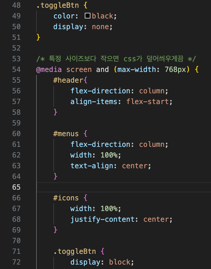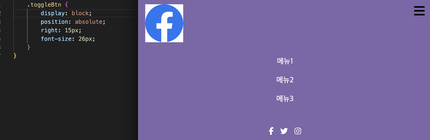 근데, 지금은 사이즈가 클 때도 메뉴바가 나타남 : css 파일에서 display: none;을 통해 사라지게 한 후, @media screen 내부에 display: block; 작성 시, 사이즈가 작아질 때만 나타나게 됨