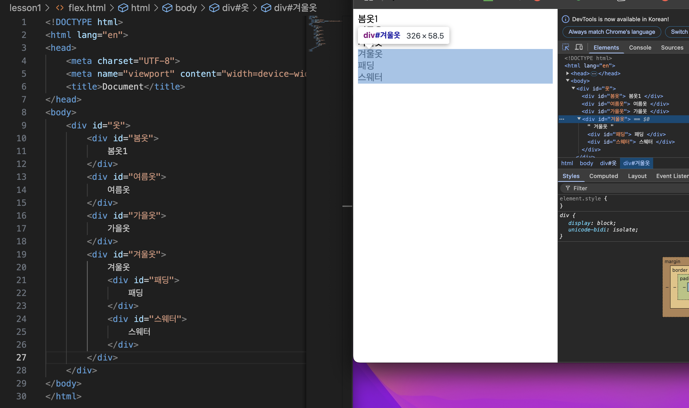 레이아웃을 준비할 때, 보통 박스로 여러 공간을 나누어 구성하는 것부터 시작 : 이는 CSS에서 'div'라는 태그를 사용하는데, 레이아웃을 나눈다(division)는 의미에서 파생 : '옷'이라는 박스 안에 봄옷, 여름옷, 가을옷, 겨울옷 박스 등