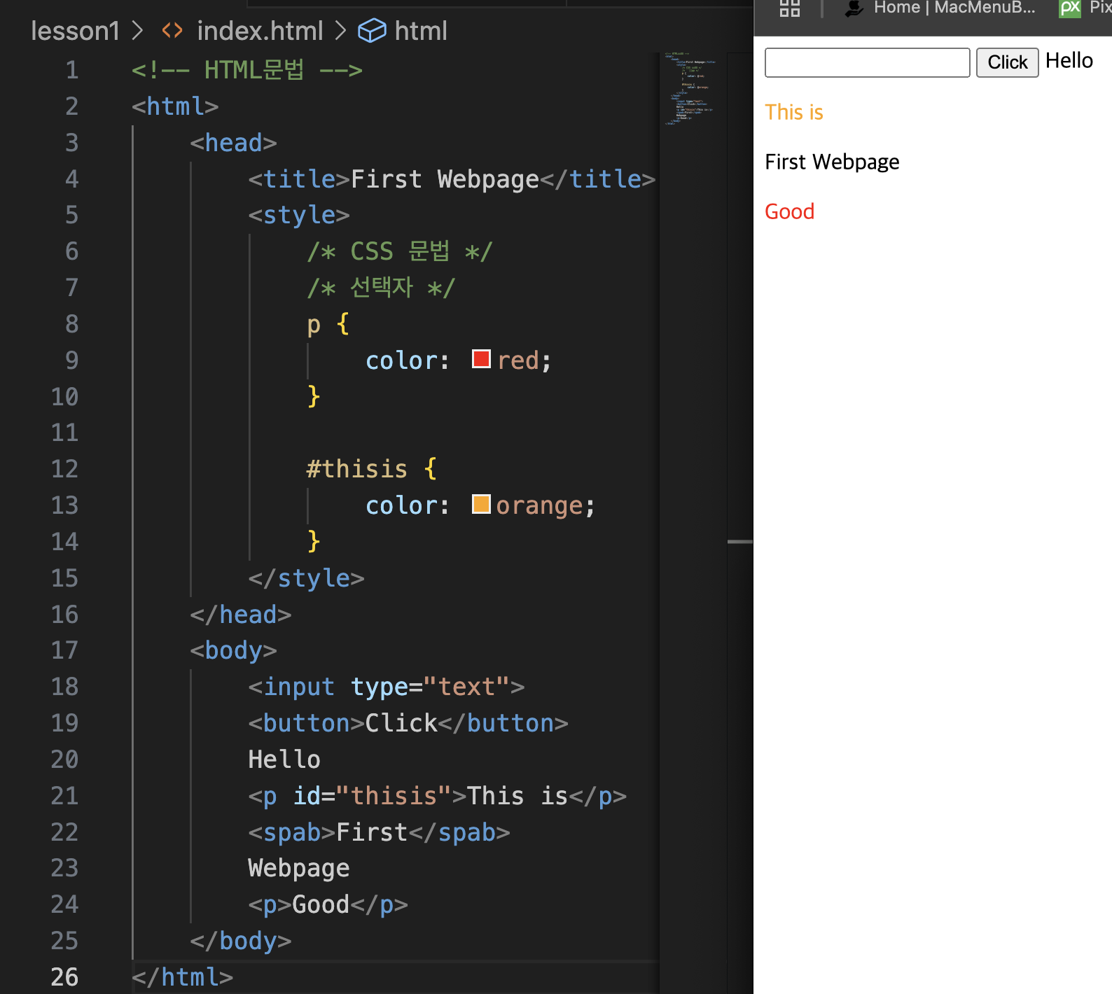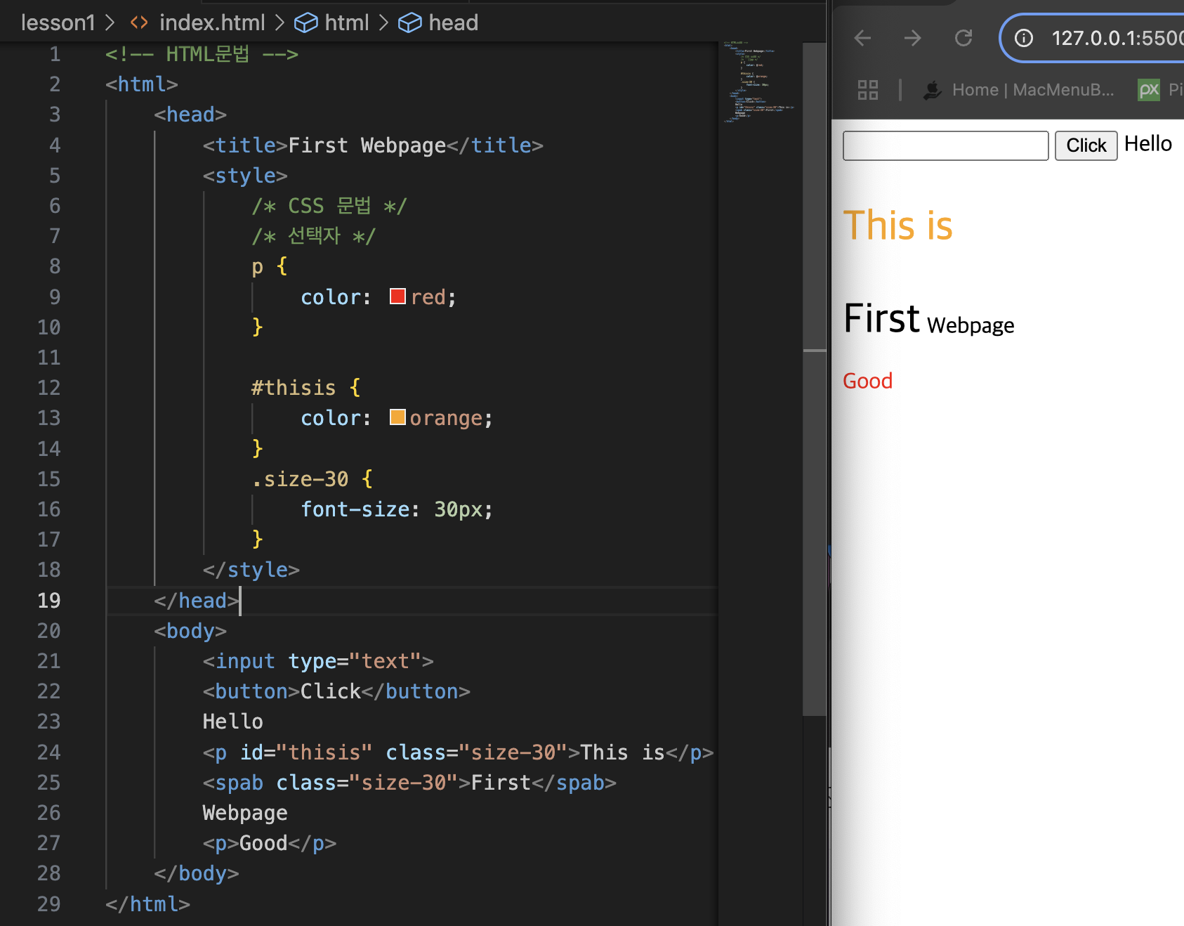 html 꾸미기 : CSS 사용 : 어떻게? : CSS 파일 생성해서 불러오기 or head 태그 안에 style 태그를 만들어서 CSS 문법 입력하기