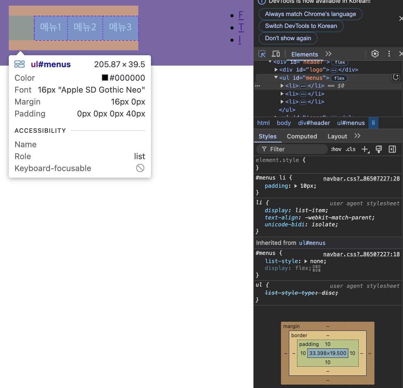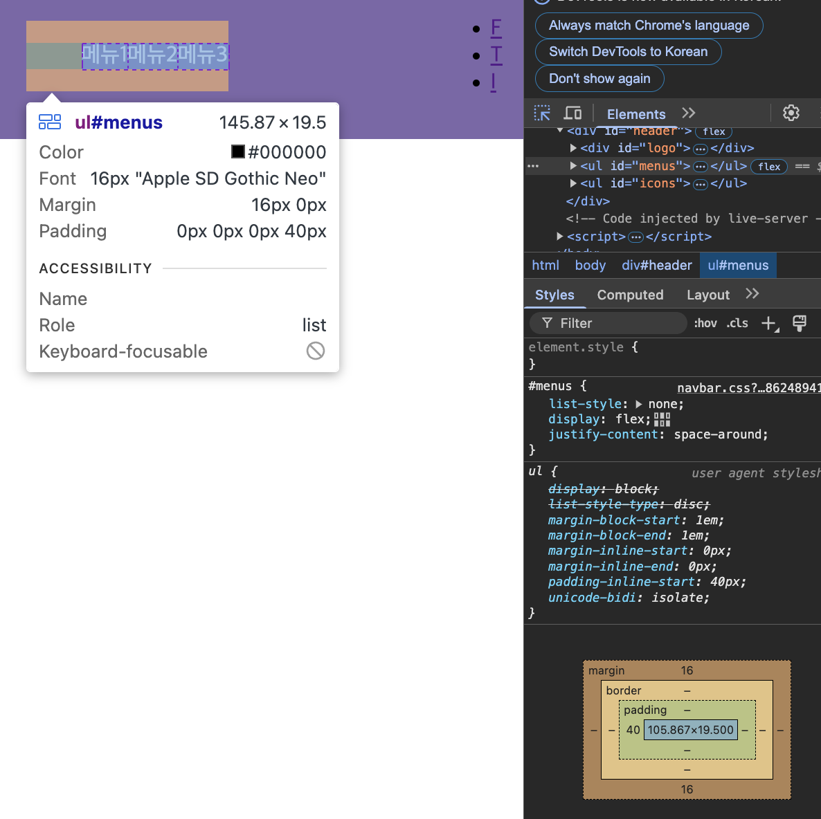 근데 메뉴1, 2, 3가 너무 딱딱 붙어있음 : menus에 flex 해서 space-around 적용하면 되지 않을까? : space-around가 적용된 상태여도 안됨