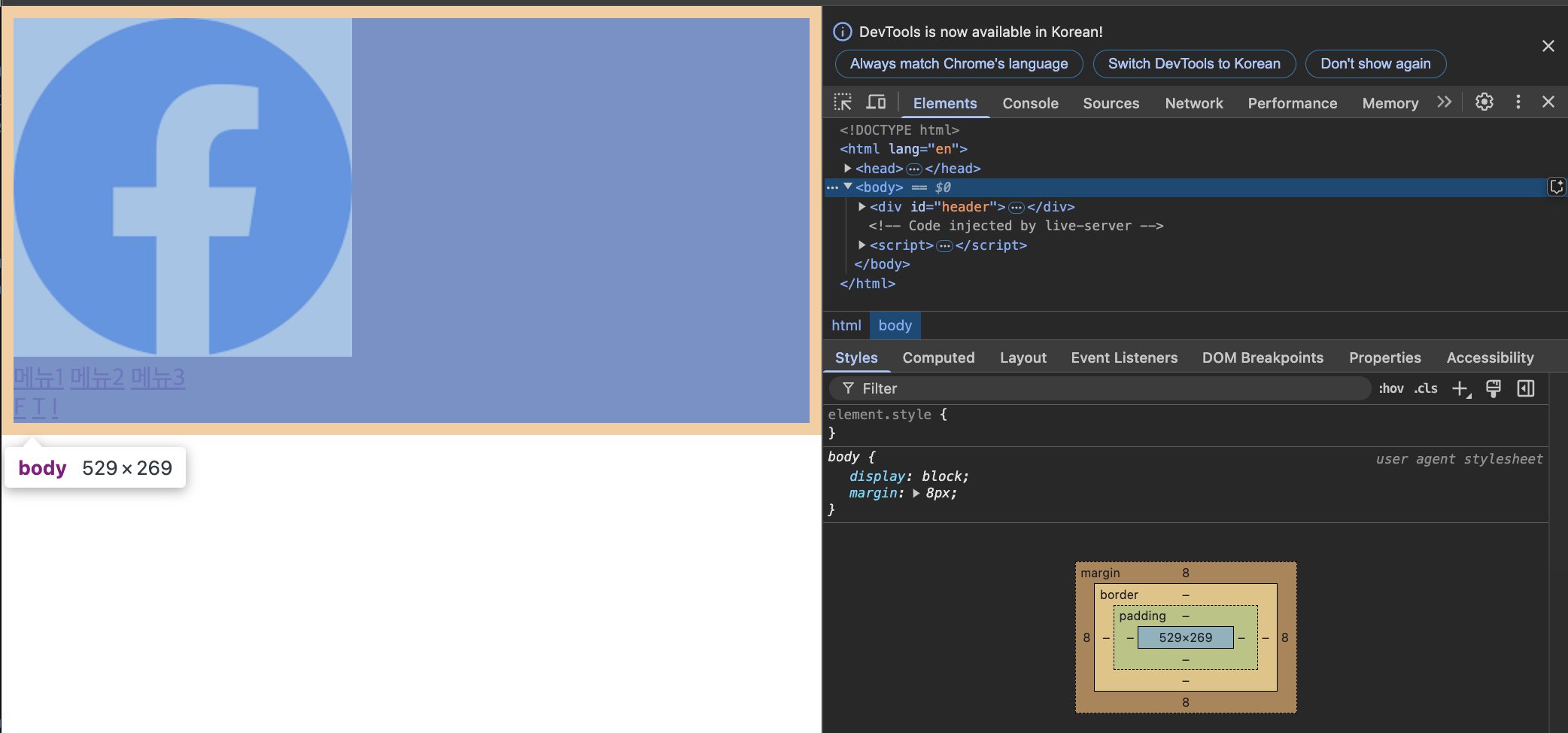 body 태그가 여백을 만들고 있음을 알 수 있고, 'margin' 이라는 값이 8로 설정되어 있음 : 이를 0으로 설정하기