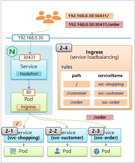 - 설정 예시: 사용자가 192.168.0.30:30431로 접속 시 (사전에 Nginx Controller = Ingress Controller가 설치되어 있는 것)