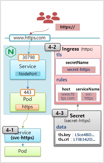 - TLS 설정: 인그레스 정의서의 tls 필드에 도메인(www.https.com)과 시크릿 이름을 매핑한다.