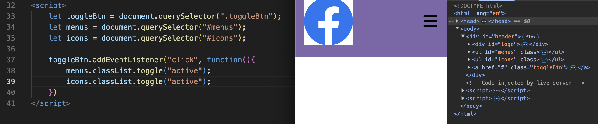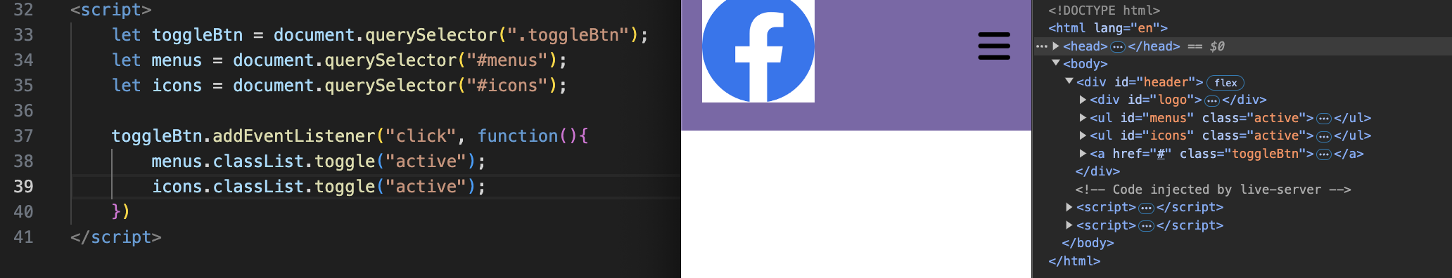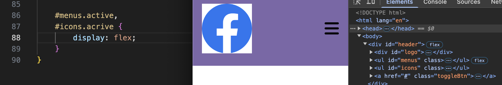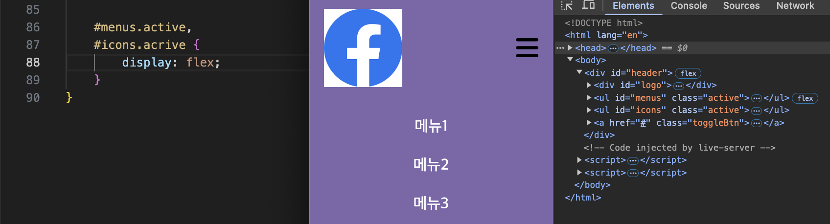 이제 그러면 id가 menus, icons이면서 class가 active면 display를 flex로 바꿀 것임
