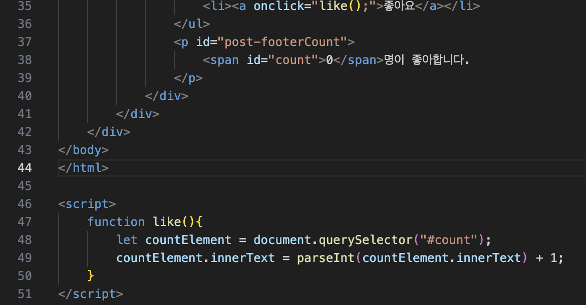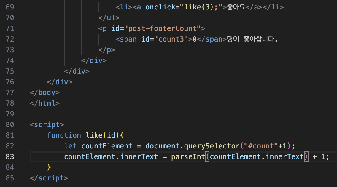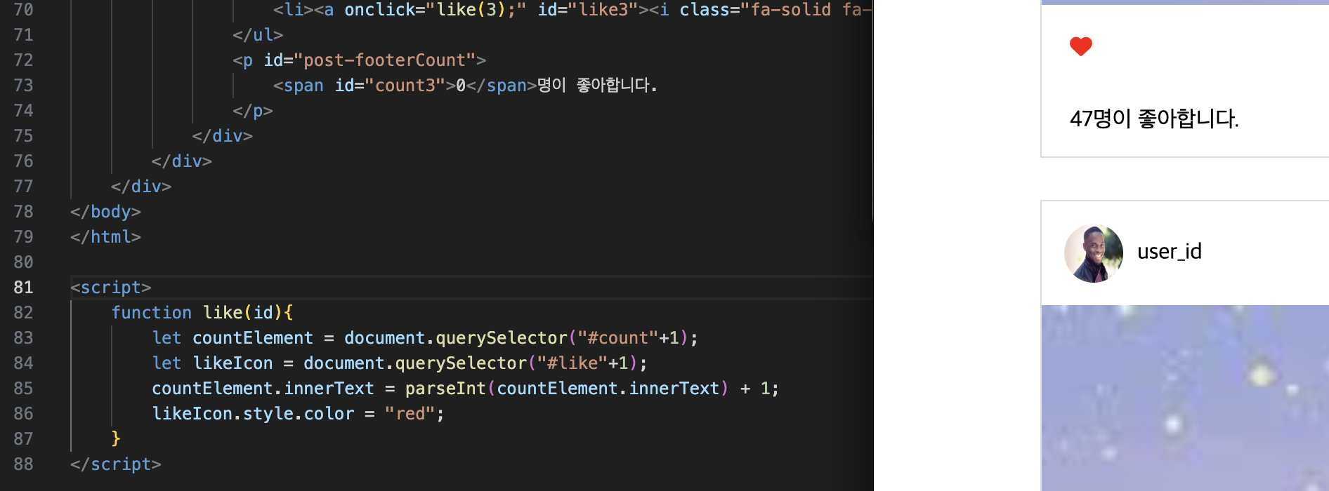 id post를 content 태그 안에 여러개 붙여 넣기 해서 게시물을 여러 가지 나오게 했을 때, 각 게시물마다 있는 좋아요 버튼을 누르면 버튼을 누른 해당 게시물만 좋아요가 늘어나게 하려면 어떻게? (현재 상태에선 안 늘어남) : span id count1, 2, 3으로 이름 짓기 : 근데 onclick = "like();"에서 like에 매개변수로 1, 2, 3을 넣어줄 것임 : script에서 like 함수 안에는 'id'라는 이름으로 변수를 넣을 것 : 그러면 첫 번째 게시물에 좋아요를 누르면 like 함수의 변수로 '1'이 전달되는 등의 형태일 예정 : 그럼 document.querySelector("#count"); 에서 #count 부분이 #count1, #count2, #count3 등으로 변경되어야 하는데, 이걸 "#count"+id 하면 같은 의미가 되니 해결