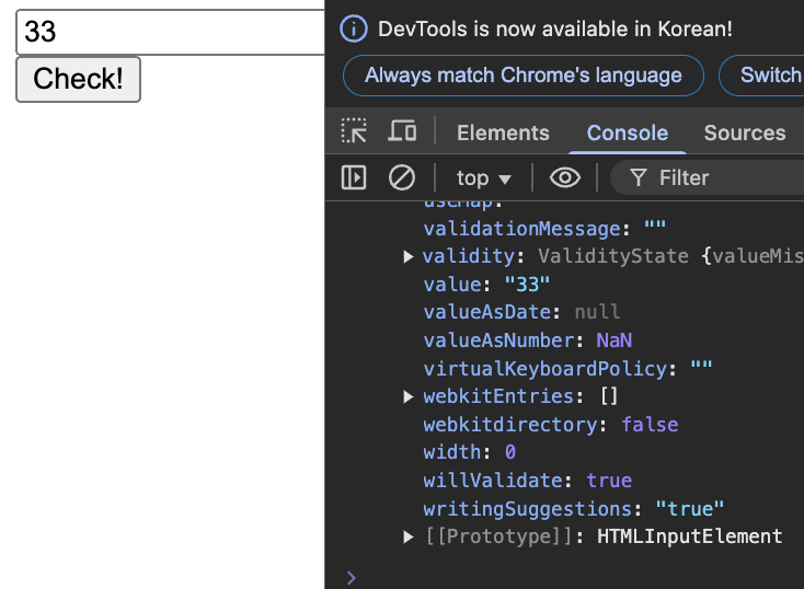 .dir은 실제 전달되는 값들을 보여줌 : 열어보면 아래와 같이 내가 입력한 '33'이라는 값이 'value'에 저장되어 있다는 것을 확인할 수 있음 : 즉, .value를 통해 접근할 수 있겠다는 생각 가능 : 즉, 어떤 태그에 대한 정보가 오브젝트에 의해서 관리되고 있다는 것을 이해