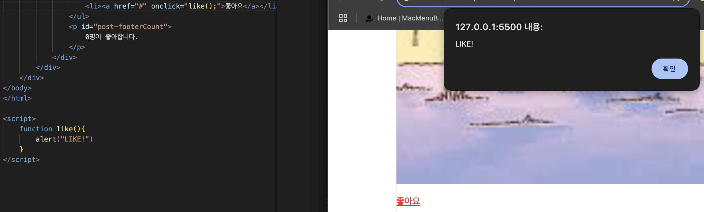 좋아요 버튼 누르자 LIKE! 알람 생성 확인 : span 태그를 통해 0을 감싸주자 : 별 의미없는 태그인데 왜 쓰냐? : id나 class 값을 줘서 span 태그에 쓰인 텍스트를 꾸며주기 위해 : javascript 태그 안 텍스트값 수정 방법 검색 : span 값 변경 : innerText : 오브젝트 안의 innerText라는 값에 접근해서 거기에 +1 한 값 넣기 구현 : 근데 href = "#"이 있으면 버튼 눌렀을 때 페이지 최상단으로 올라가게 되기 때문에 지우기