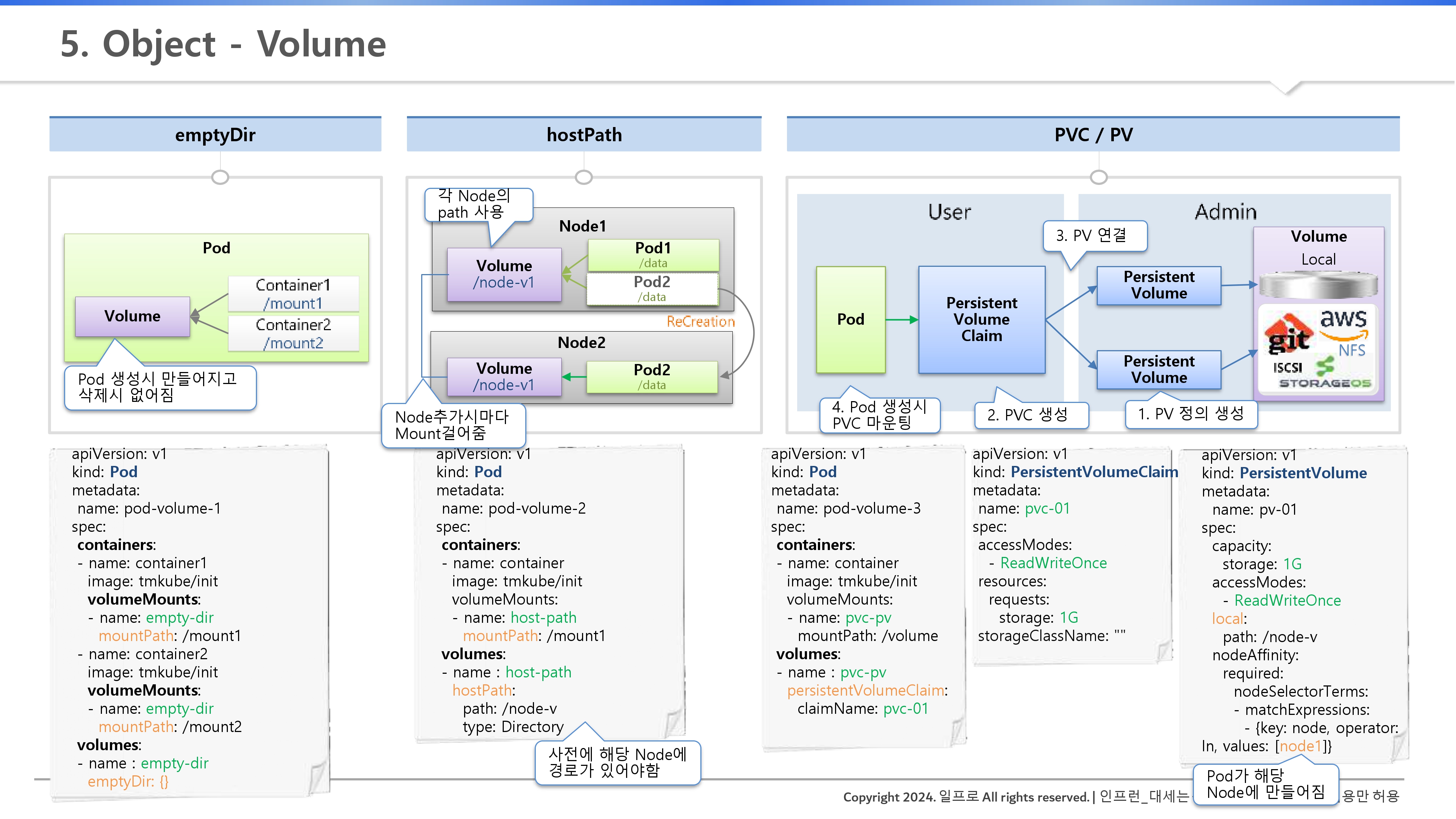 - 물론, 굳이 방법을 찾는다면 쿠버네티스가 하는게 아닌 운영자가 수동작업을 할 수는 있음 (Node 추가시마다 별도의 마운트 기능을 사용)