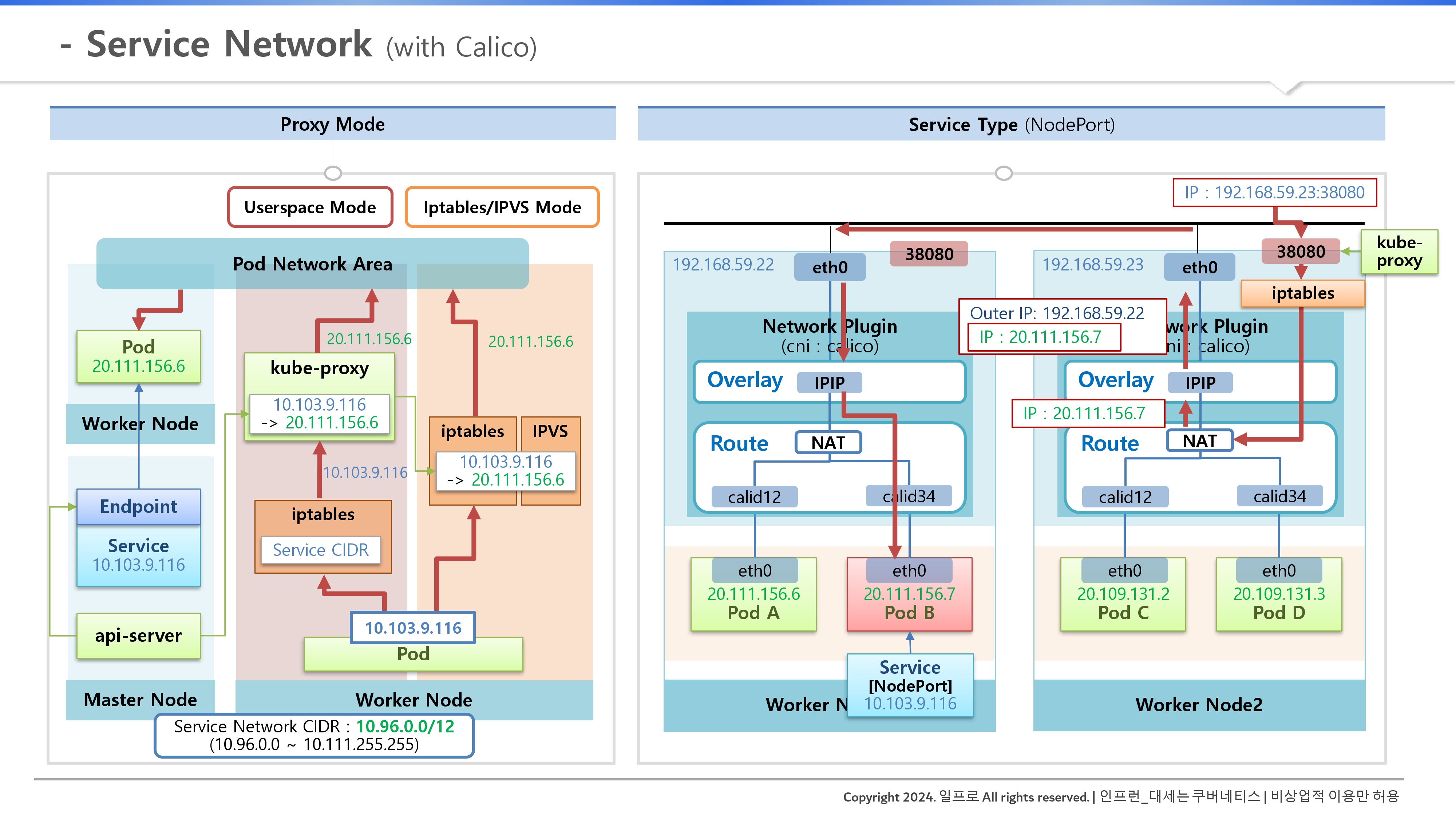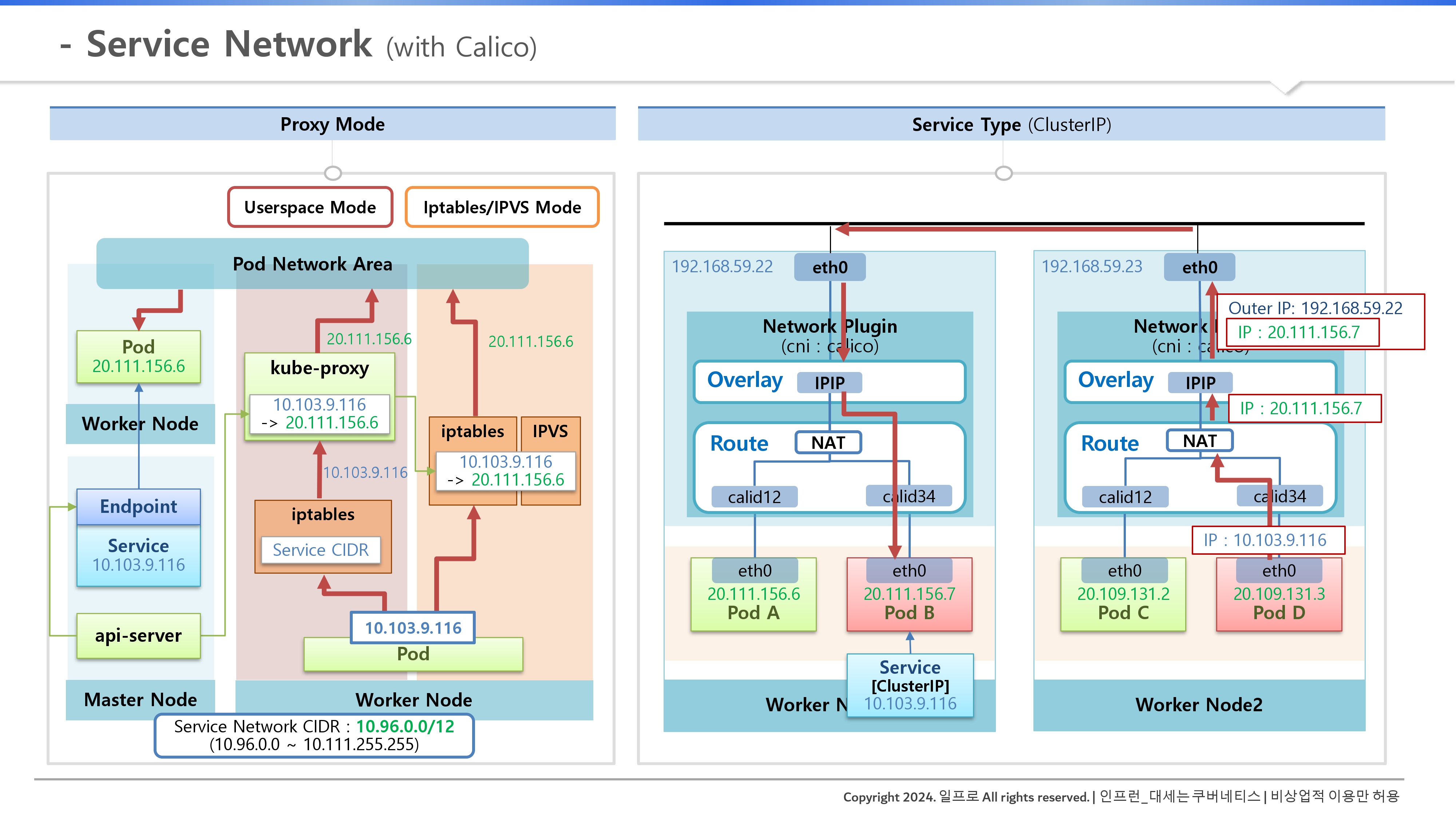 - 오버레이 캡슐화: 변환된 파드 IP는 이제 앞서 배운 파드 네트워크 단(Pod Network Area)으로 넘어가, 오버레이 네트워크(IPIP 등)를 통해 캡슐화되어 노드 간 이동을 시작한다.