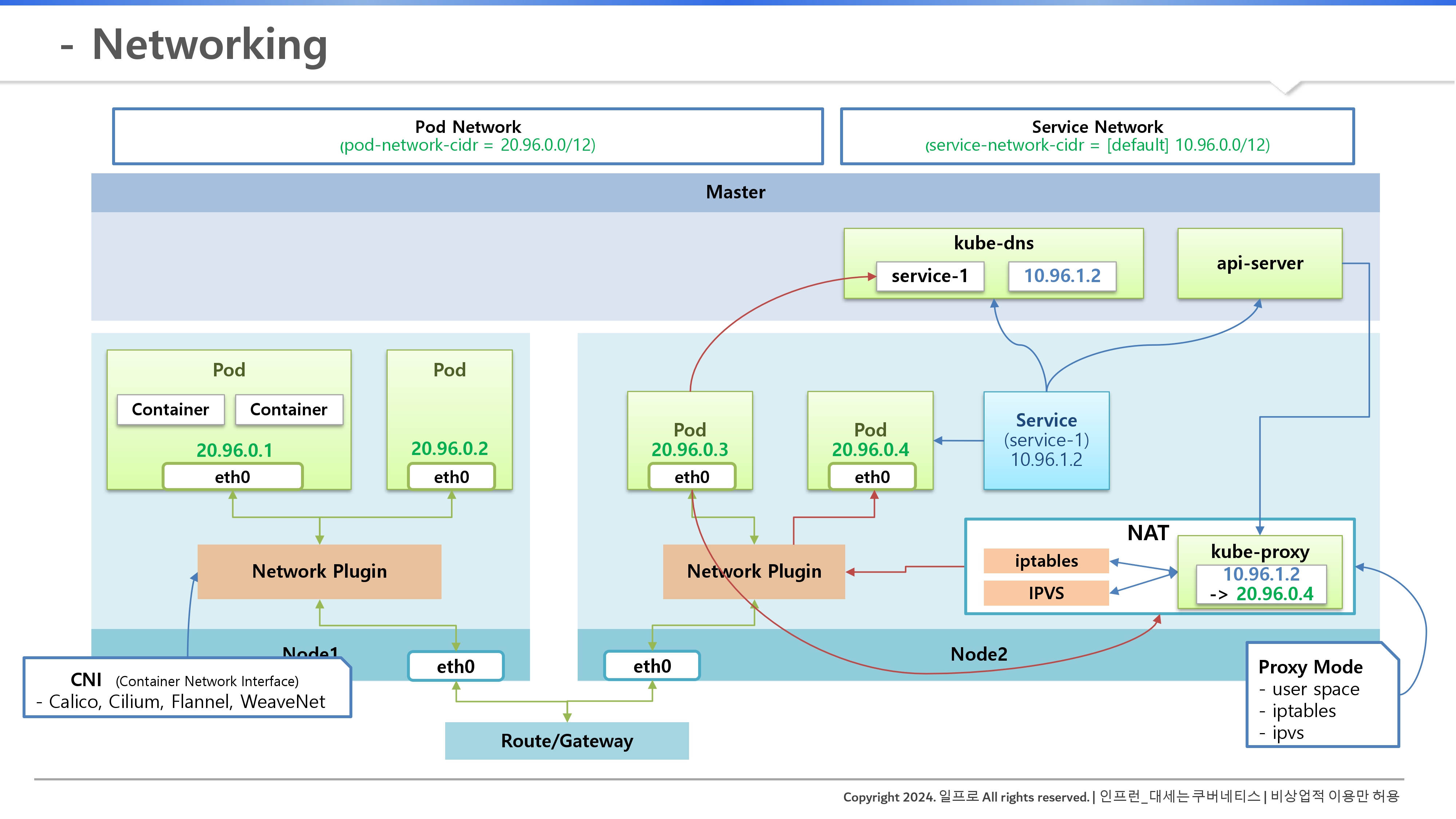 | 관리 주체 | CNI 플러그인 (Calico 등) | kube-proxy (iptables/IPVS) |