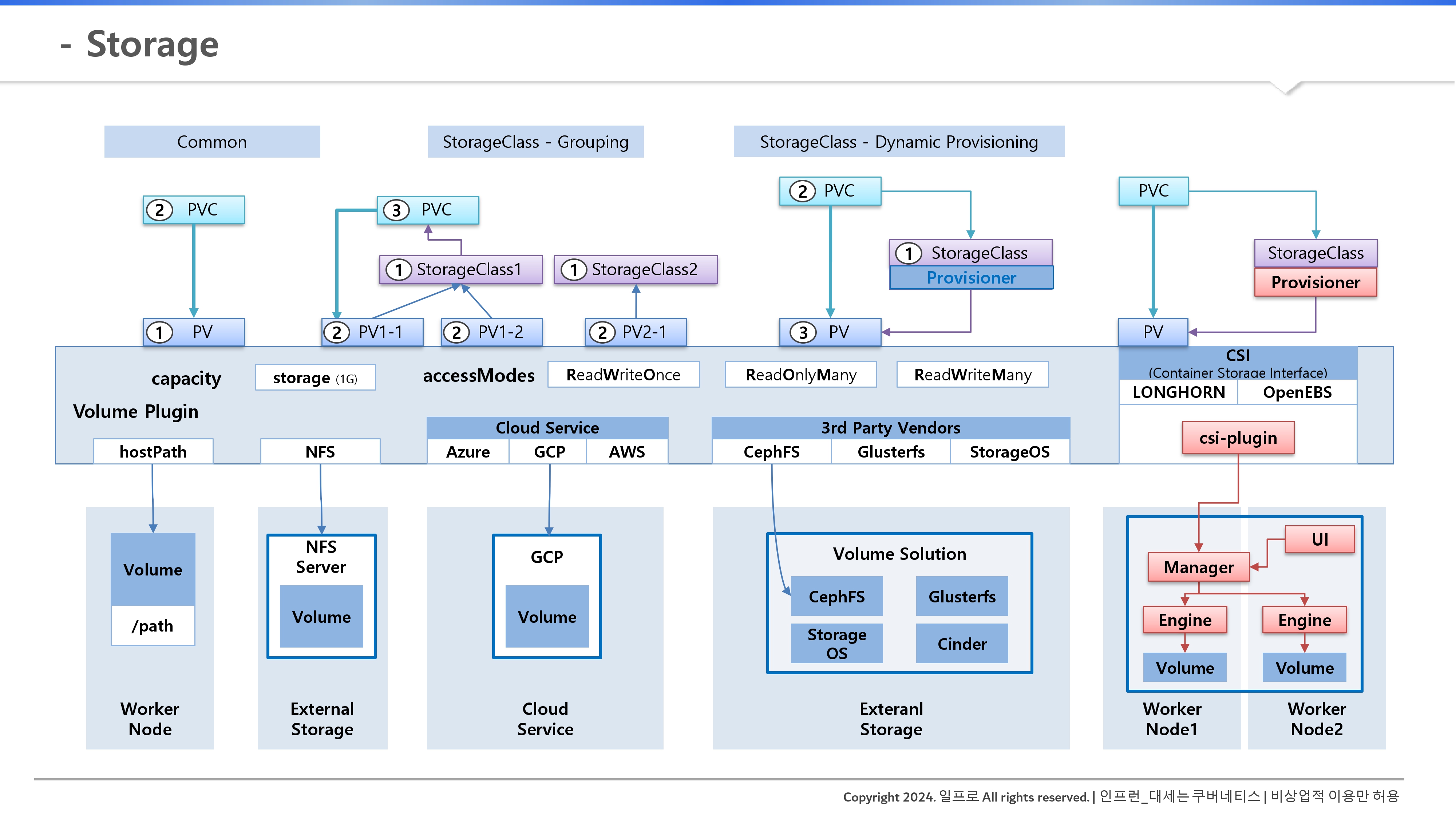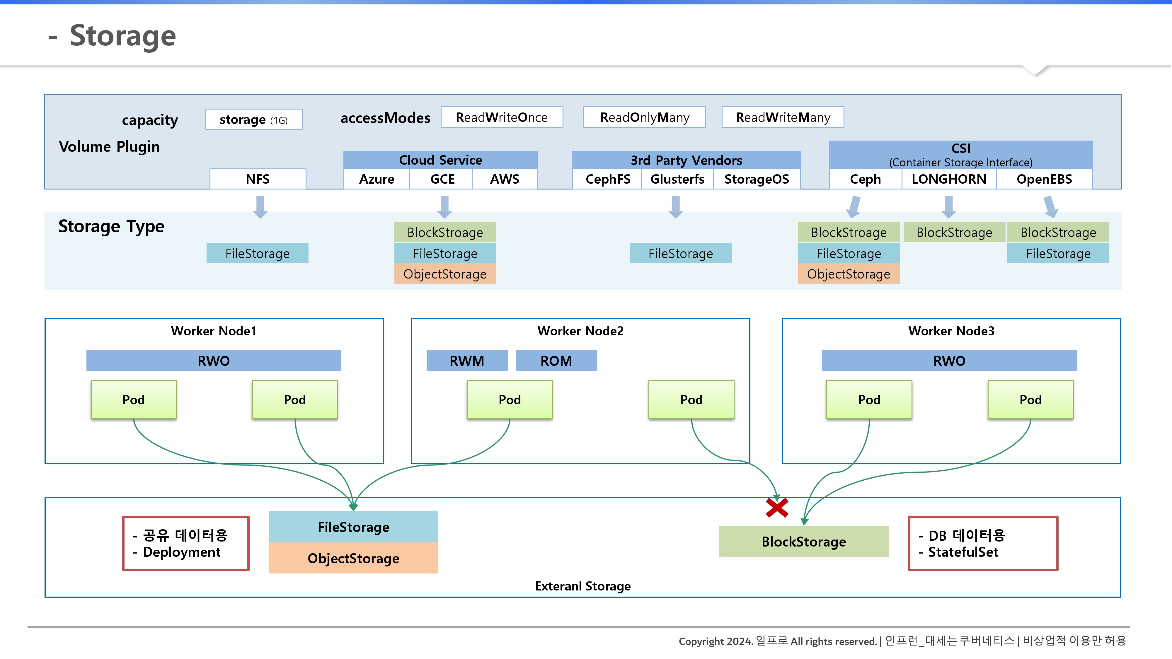 | Object Storage | AWS S3, Azure Blob | 이미지 저장, 백업용으로 주로 사용 | RWO, ROX, RWM |