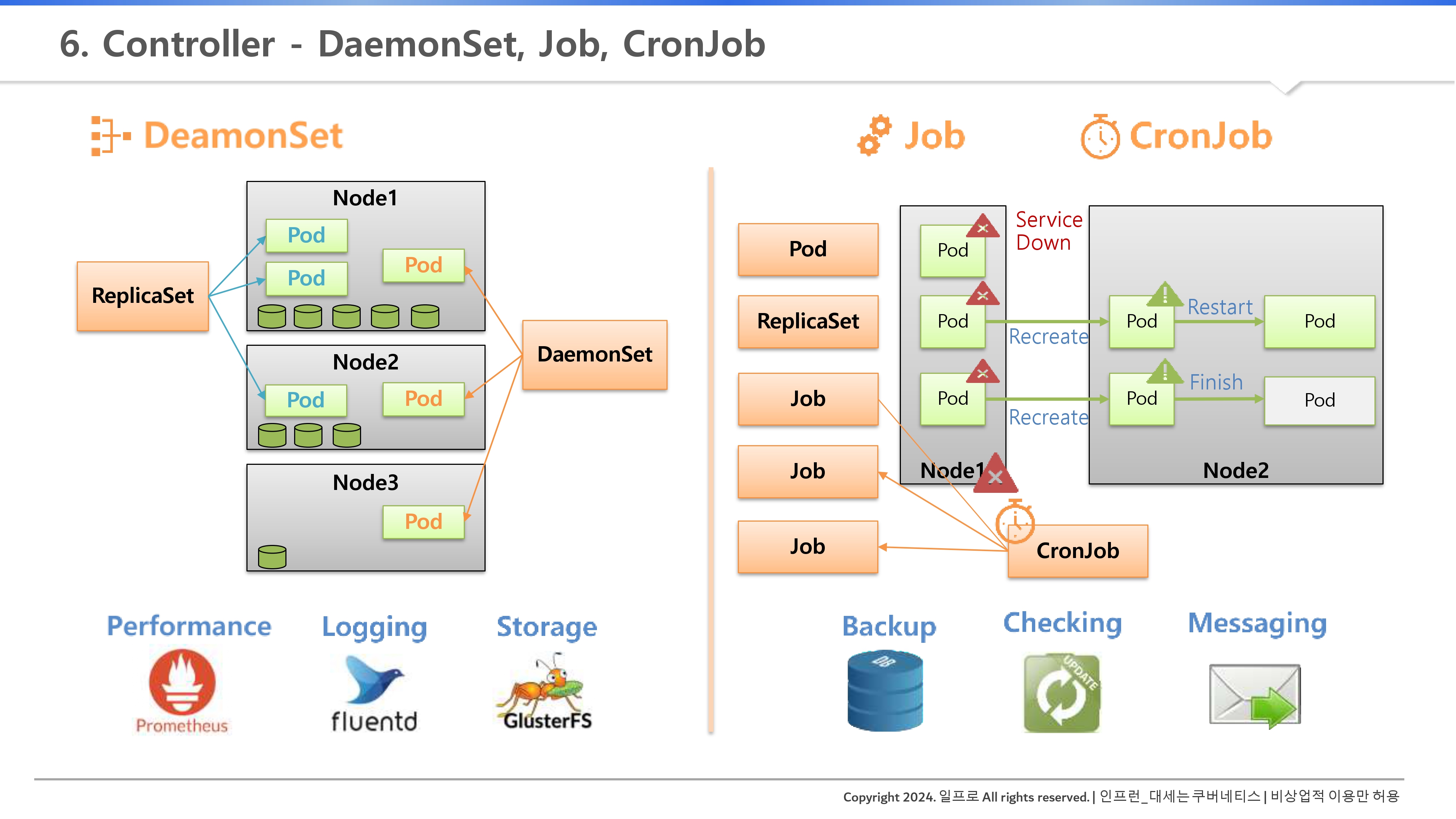 - 성능 수집(Prometheus), 로그 수집(Fluentd), 네트워크 프록시(Kube-proxy)처럼 노드 전체를 관리해야 하는 에이전트 설치에 필수적이다. 즉, 이렇게 각각의 노드마다 하나씩 설치해야하는 서비스들이 있는 것을 때 필수적이다..
