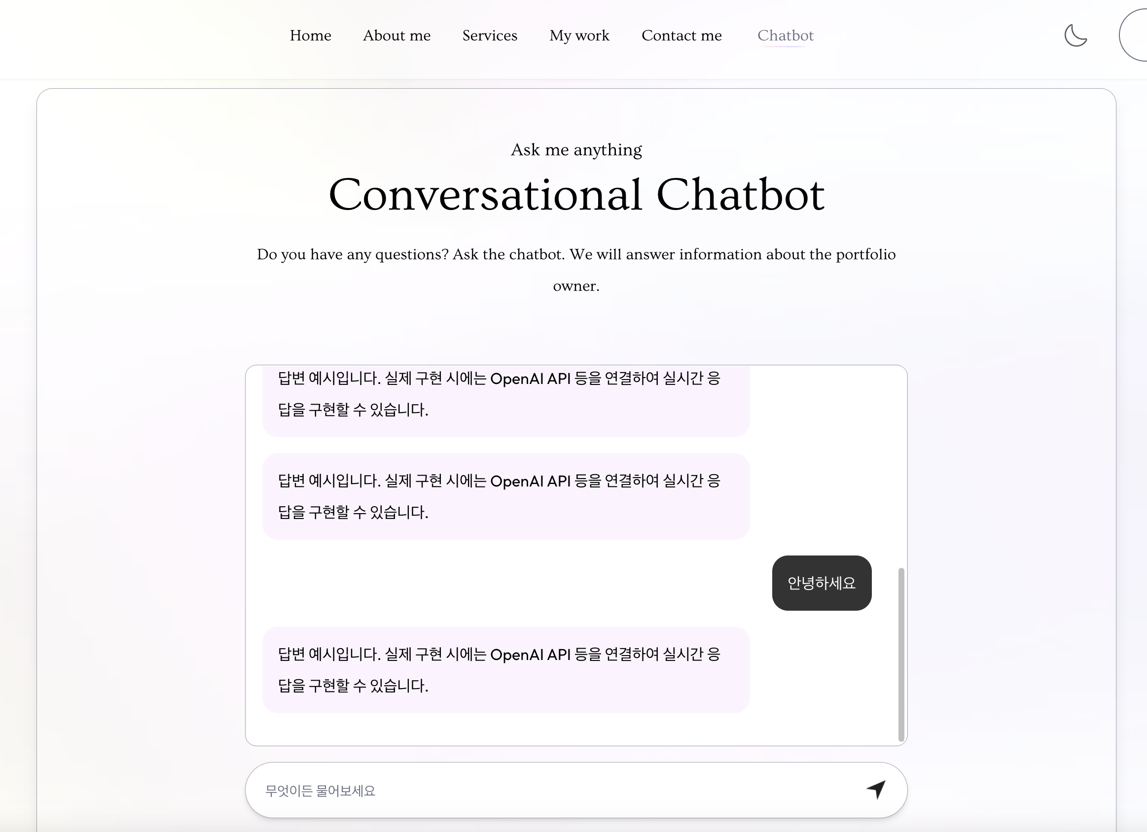 1. 해당 Portfolio 폴더는 저의 포트폴리오 웹 사이트를 구현한 파일들로 구성되어 있습니다. 저의 코드베이스를 바탕으로 대화형 챗봇 컴포넌트를 구현해주세요. 컴포넌트를 만드는 저의 목적은 포트폴리오 웹사이트를 보는 사람 입장에서 이 사람에 대한 궁금한 점이 생겼을 때, 해당 기능을 활용해서 chatgpt와 같은 AI와 대화하면서 저의 정보를 답변해주는 것입니다. @compoents/Chat.jsx로 구현 부탁합니다. 먼저 현재 프로젝트는 React + Tailwind + motion 기반이며 코드 구조는 이미 잡혀 있습니다. 유의할 점은 해당 코드는 다크모드, 모바일 버전도 지원한다는 점입니다. 다음 조건을 만족하는 컴포넌트를 만들어주세요. 1. Contact 컴포넌트 아래의 위치에 위치할것, 2. About, Contact, Services, Work 컴포넌트들을 보면 사이에 간격이 일정한 것을 확인할 수 있는데, 이처럼 간격을 유지하면서 디자인의 구조를 망가뜨리지 않고 Chat 컴포넌트를 추가할 것 3. chatgpt등 대화형 AI처럼 채팅 메시지 목록과 입력창이 포함. 4. tailwind + motion을 활용해 현재 제작된 포트폴리오 디자인과 똑같은 폰트를 사용. 즉, 폰트와 색상도 기존 스타일에 어울리게 맞춰주셔야합니다. 이때 주의할 점은 다크모드와 모바일 버전 시의 디자인도 고려해야합니다. 앞으로 다크모드, 모바일모드를 말하지 않아도 알아서 고려해서 설계. 5. Chat 컴포넌트의 헤더는 Ask me anything과 Conversational chatbot으로 시작